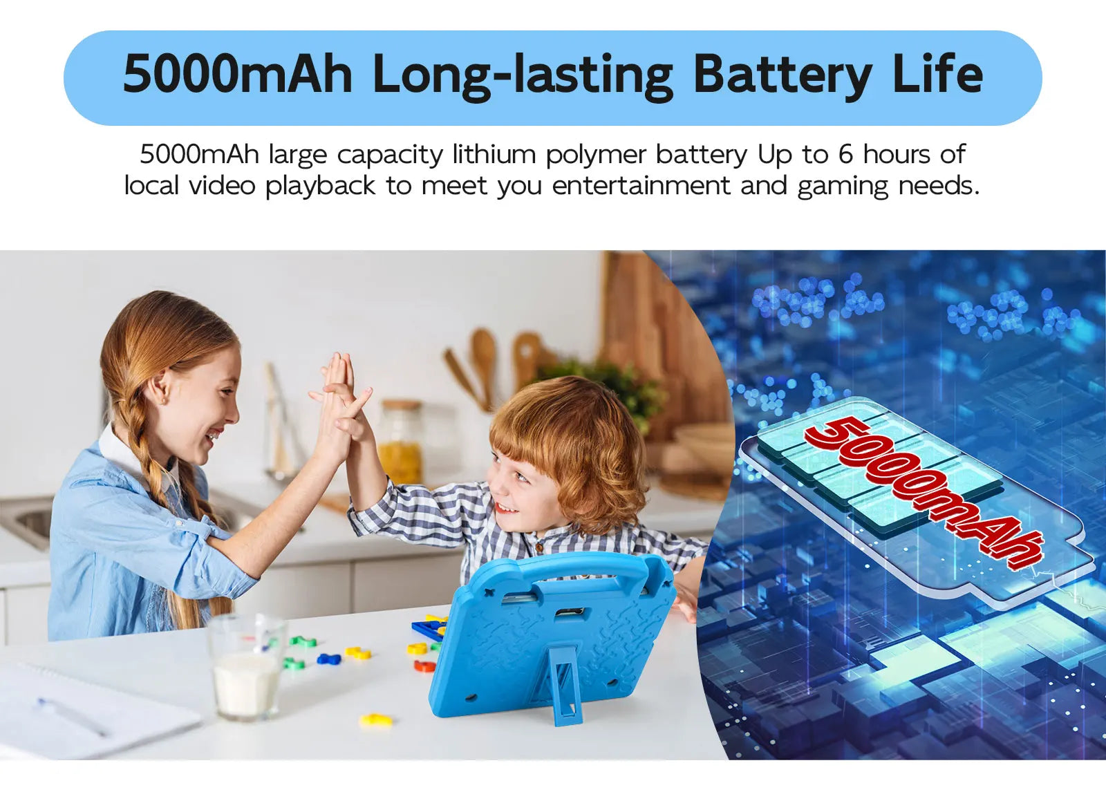 This 10.1 inch kid tablet for boys or girls is a good friend in gaming and learning, it includes front 2mp+ rear 5mp cameras with flash, and 5000mAh battery ensures 4-5 hours of video playing on a single charge. The dual box speakers give you the ultimate audio-visual enjoyment.