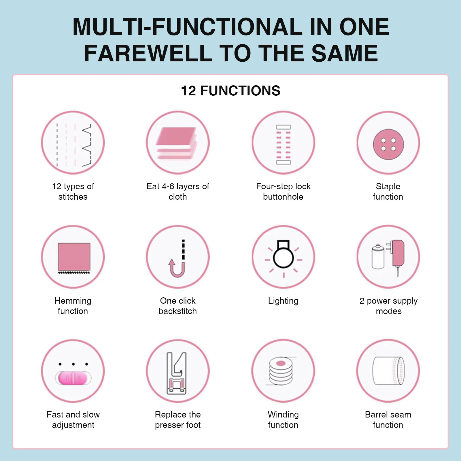 12 Versatile Stitch Patterns: Tackle a variety of sewing tasks with ease. From straight stitches for seams to decorative patterns for crafts, this machine is equipped for sewing buttons, buttonholes, zippers, and hems.