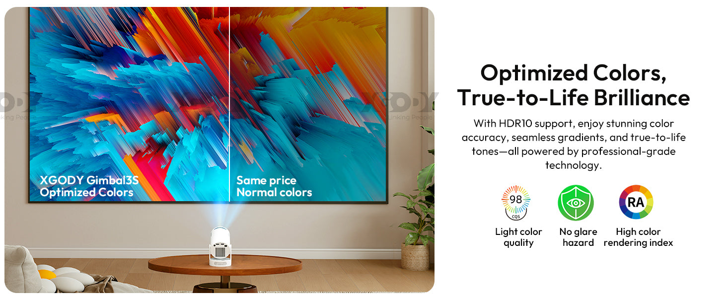 Effortless Positioning, Big Screen Fun. The XGODY Gimbal 3S projector combines a flexible gimbal stand with a space-saving short-throw design. Enjoy a sharp 720P picture with modern WiFi 6 and Bluetooth 5.4, perfect for small spaces and easy setup.