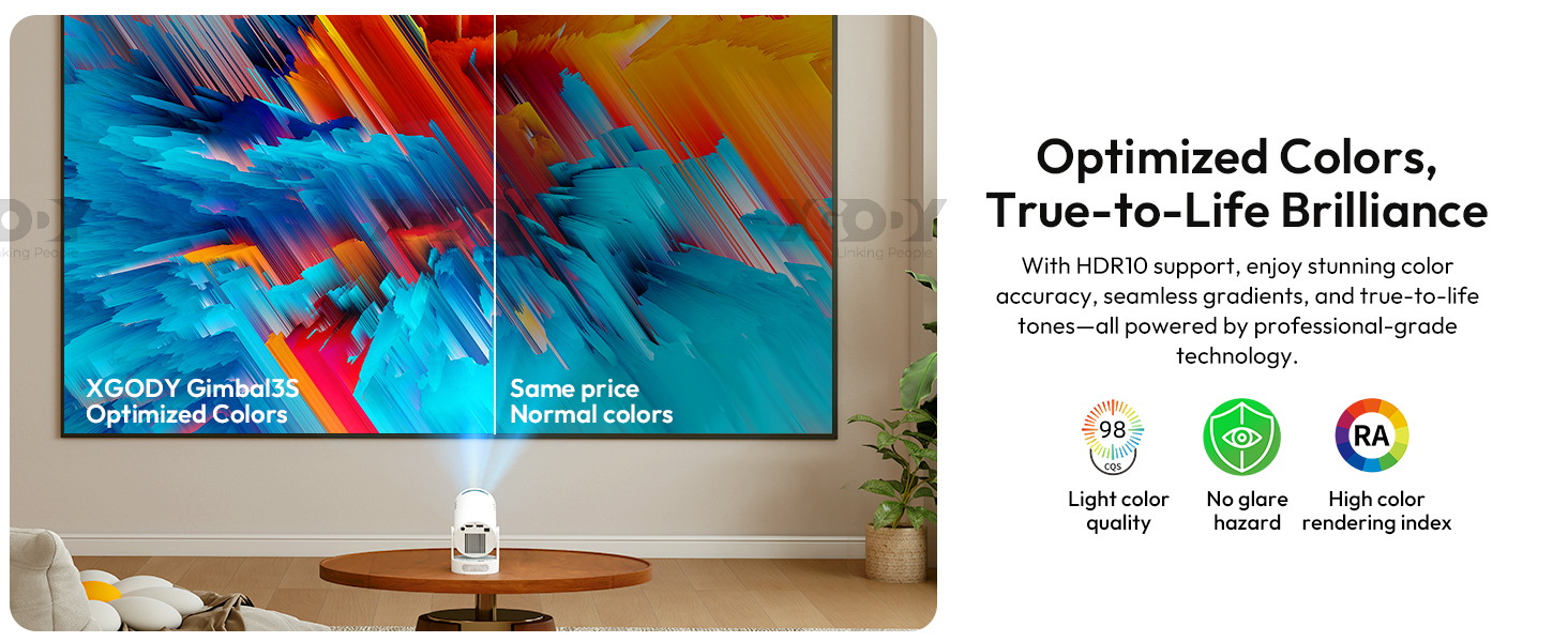 Effortless Positioning, Big Screen Fun. The XGODY Gimbal 3S projector combines a flexible gimbal stand with a space-saving short-throw design. Enjoy a sharp 720P picture with modern WiFi 6 and Bluetooth 5.4, perfect for small spaces and easy setup.