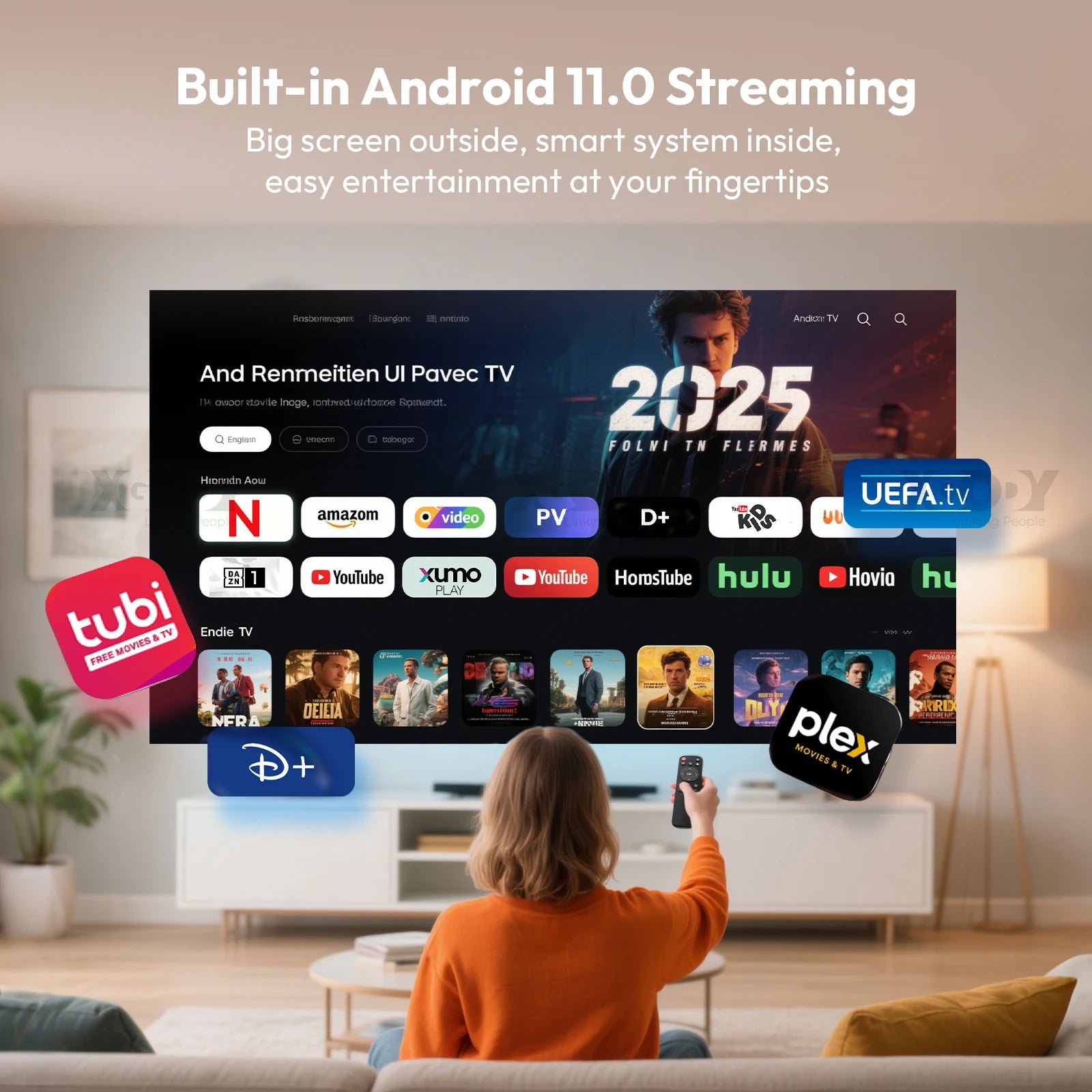 ANDROID 11.0 SMART SYSTEM – Sehen Sie sich mit diesem Miniprojektor Filme an und streamen Sie Ihre Lieblingsinhalte direkt von den meisten integrierten Apps, ohne dass zusätzliche Geräte erforderlich sind. So wird Unterhaltung bequemer und ist jederzeit und überall zugänglich. |